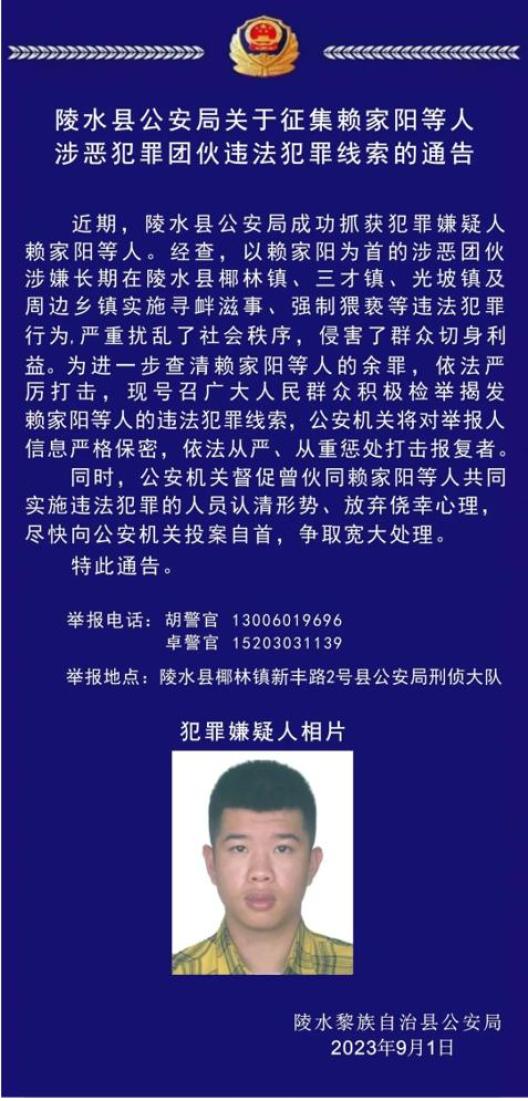 11.海南陵水县警方通报一涉黑违法犯罪团伙:2日,海南省陵水县公安局官方微信公众号发布《关于征集赖家阳等人涉恶犯罪团伙违法犯罪线索的通告》。《通告》显示,近期,陵水县公安局抓获犯罪嫌疑人赖家阳等人。为进一步查清赖家阳等人的余罪,依法严厉打击,现号召广大人民群众积极检举揭发赖家阳等人的违法犯罪线索,公安机关将对举报人信息严格保密,依法从严、从重惩处打击报复者。(人民日报客户端)