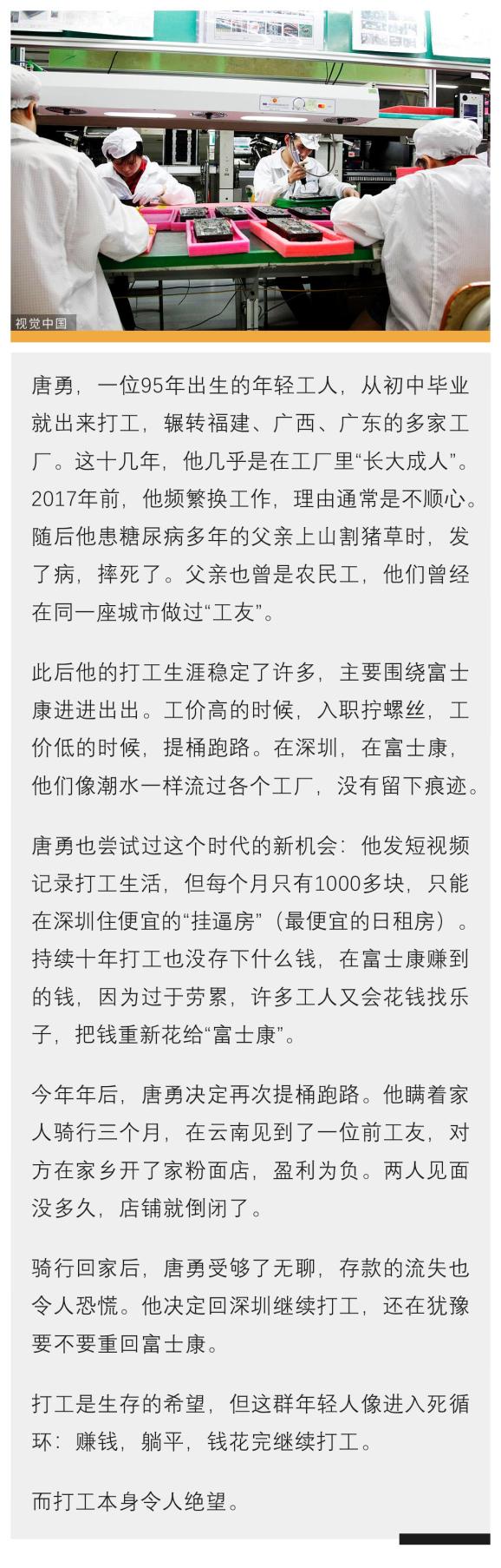 2月份回到深圳之后,富士康的工价也不是很高,我觉得很迷茫:名义上和家人说的是出来进厂打工挣钱,但确实不想再去拧螺丝。这些年在不同的工厂打工,我差不多攒下了10万块,决定瞒着家人躺平一阵子。