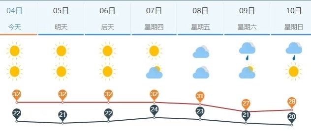 7~8日晴转多云,南风3级,最高气温32℃左右。