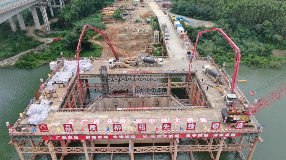 9月2日,在武宣县金鸡乡马鞍山村盘龙柳江特大桥主桥施工现场,随着首方混凝土的泵入,新建柳州至广州铁路柳州至梧州段(以下简称“柳梧铁路”)LWZQ-2标控制性工程盘龙柳江特大桥主桥33#主墩承台开始混凝土浇筑施工,标志着大桥主墩又一重要里程碑节点顺利完成。