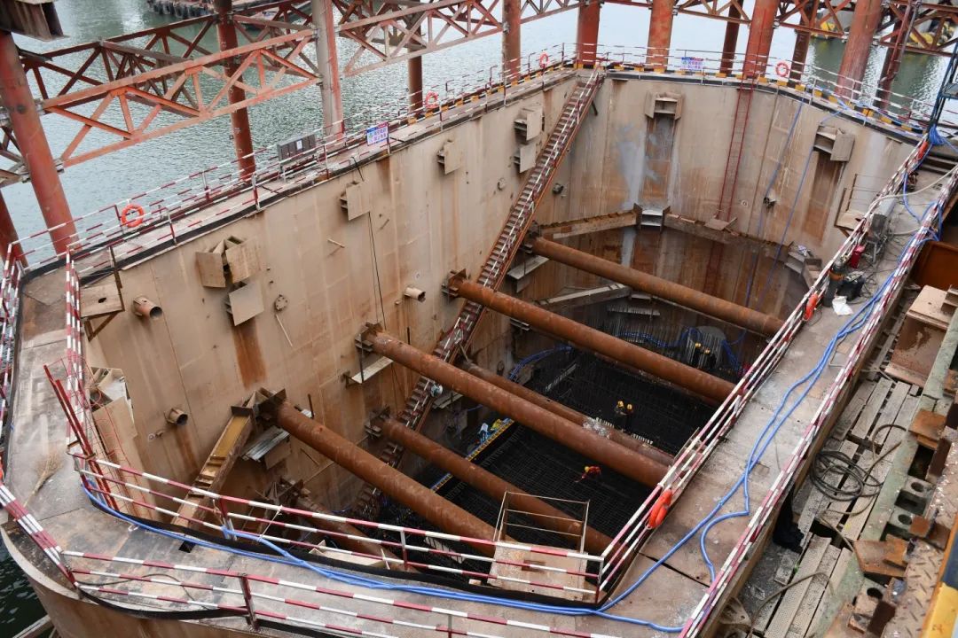 盘龙柳江特大桥是柳梧铁路项目控制性工程之一,大桥全长3787.424米,主桥全长629米。主桥两个主墩均位于柳江江中,主墩处水深约24米。主墩采用16根直径2.8米桩基础,采用36米高双壁钢围堰进行围护施工,钻孔灌注桩采用钢平台将水上施工变为陆地施工。本次浇筑33#主墩承台为六角形,横桥向长度32.57米,顺桥向宽度15.5米,承台厚4.5米,设计C40混凝土2030立方米,承台采用一次性浇筑施工,需不间断作业近30小时。