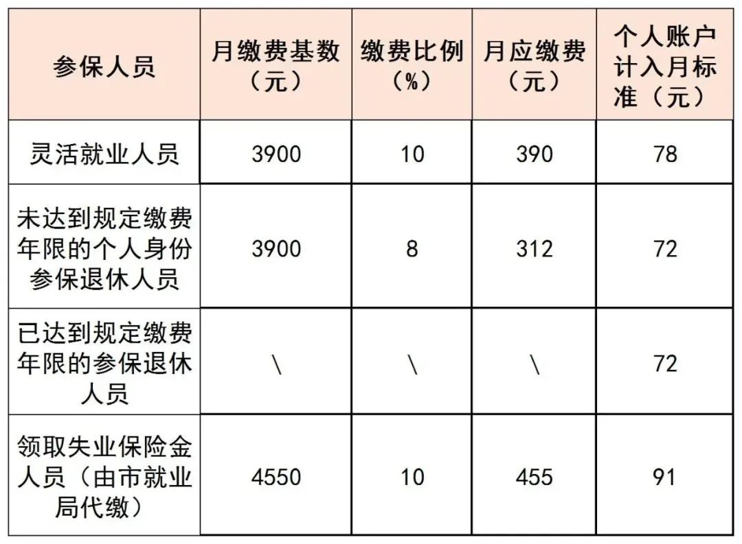 缴费年限未达到我市规定标准的灵活就业退休人员,缴纳职工基本医疗保险费标准为我市职工社会保险缴费基数月标准(即6500元)的60%,按8%的缴费比例申报缴费;个人账户按72元/人的月标准计入。