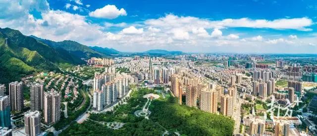 从高空俯瞰清新城区,远山美景与蓝天白云相伴随,构成一幅美丽宜居的画卷。伍志勇 摄