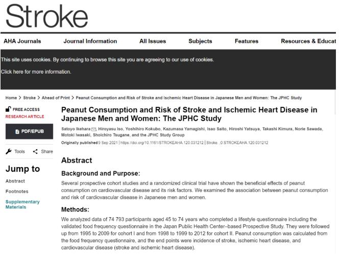 国际著名期刊《卒中》上也曾刊登过一篇研究,结果显示每天吃4粒花生的人和不吃花生的人相比,缺血性中风风险、全脑卒中风险和心血管疾病风险分别下降了20%、16%和13%。
