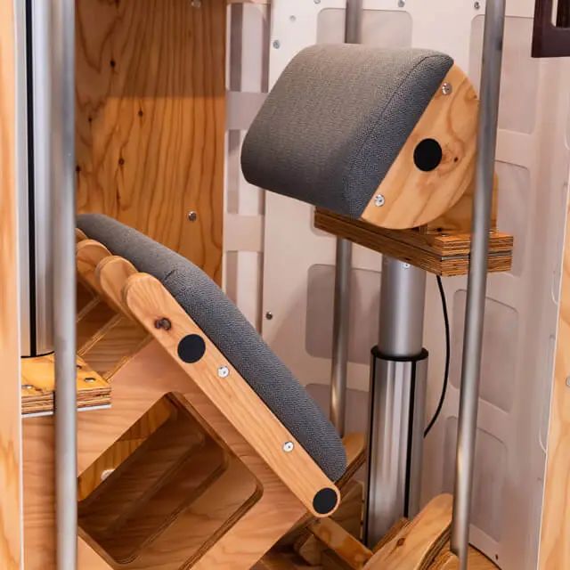打开舱门,里面配备了趴着睡的小桌板、脚踏板、倾斜的座椅,以及一个支撑小腿的特殊装置。
