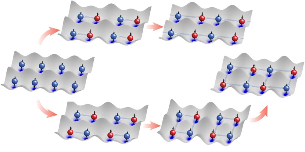 量子气体显微镜和晶格中多体纠缠态示意图。(中国科学技术大学供图)量子纠缠是量子计算的核心资源,量子计算的性能将随纠缠比特数目的增长呈指数增长。因此,大规模量子纠缠态的制备、测量和相干操控是该研究领域的核心问题。在实现量子比特的众多物理体系中,光晶格中的超冷原子比特具备良好的相干性、可扩展性和高精度的量子操控性,成为实现量子信息处理的理想体系之一。
