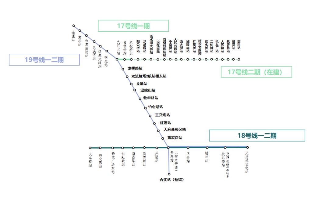 19号线二期作为市域快速轨道交通中联络天府新中心至双流、温江的城轨快线,19号线二期将于天府站过轨后与18号线共线运营,衔接双流国际机场和天府国际机场两个门户枢纽。