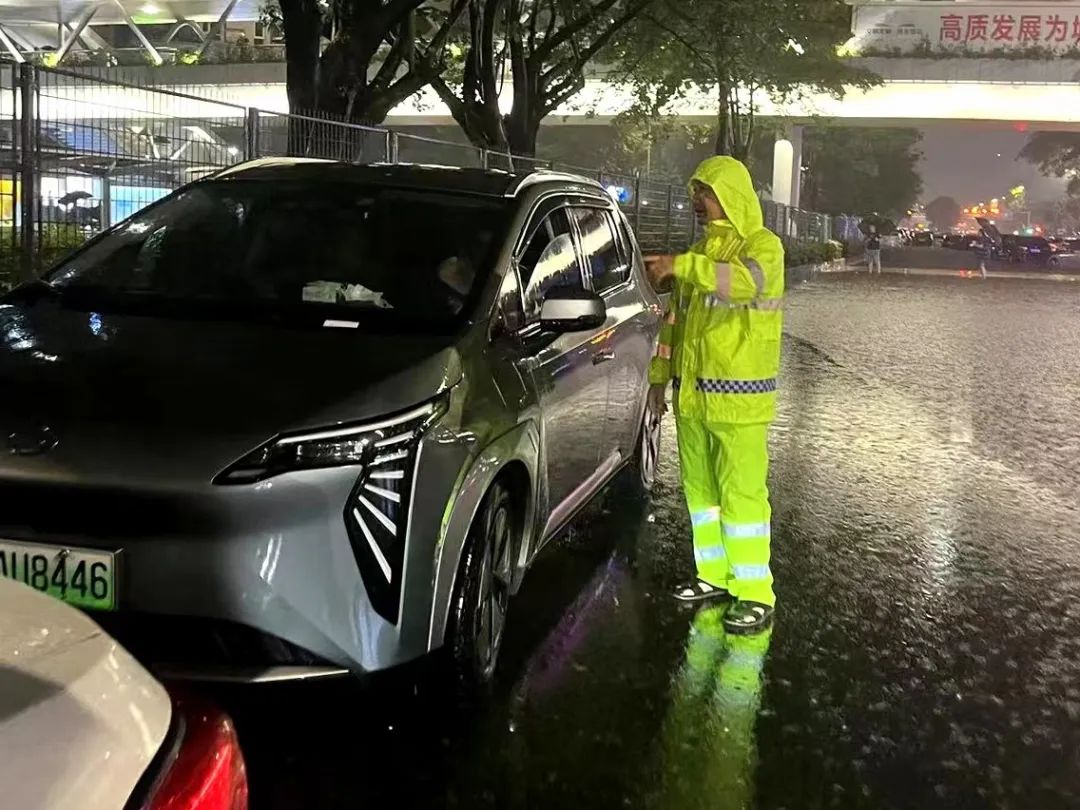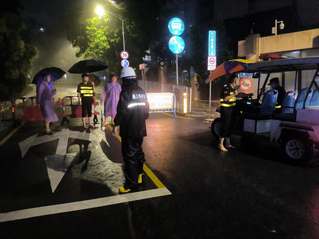 龙城街道嶂背社区工作人员对部分内涝积水路段进行管控。