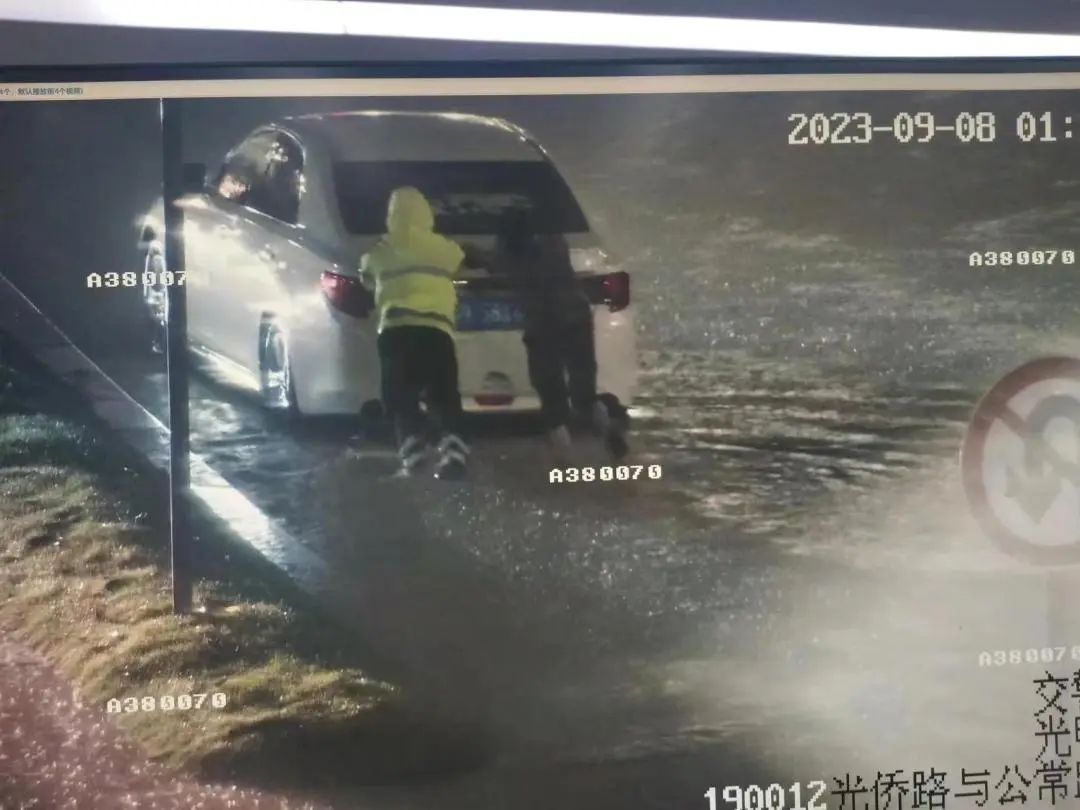 凌晨2点30左右,在福田区南园街道一辆载有乘客的出租车受困于积水中。出租车司机在确保安全的前提下缓慢行驶出积水区,送乘客回家。围观群众们也在确保自身安全的前提下,为出租车司机加油鼓劲。