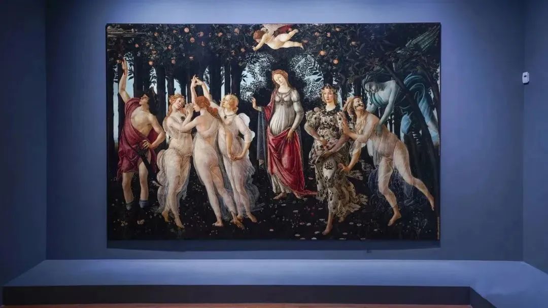 注:在“波提切利与文艺复兴”展厅之外,有两件《维纳斯的诞生》和《春》的仿真复刻画,是东一美术馆获意大利乌菲齐美术馆独家授权,在意大利本土委托专业机构以科技与手工描绘相结合的独特方式打造,选用与波提切利原作相似的底板打造,并在金色部位采用了24k真金,按原尺寸制作。