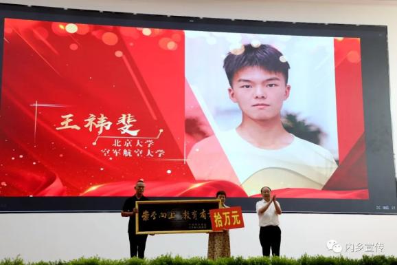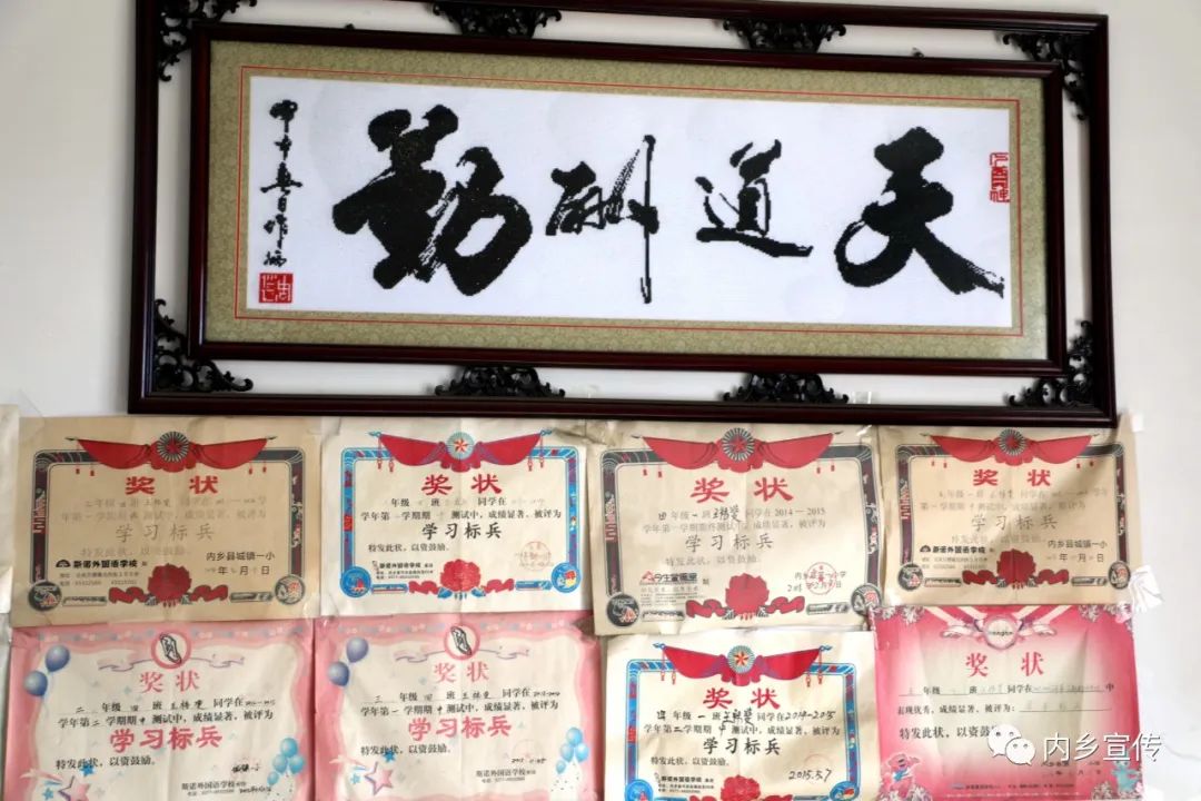 王祎斐该上小学了,虽然家境一般,但是家里仍然决定借钱在县城买房,只为孩子能在县城上小学。为了鼓励孩子勤奋学习,不会刺绣的母亲郭亚丽硬是咬牙拿起了针线,倾注一个多月的心血一针一线地完成了刺绣作品“天道酬勤”,装裱后悬挂在孩子床头。不知道小祎斐是否能够理解,不过说来也怪,在内乡一小上学期间,王祎斐还真养成了良好的学习生活习惯,每天放学回家先做作业,作业写不完坚决不玩,成绩也名列前茅。每年高考后,郭亚丽还有意无意地带着小祎斐在内乡高中高考光荣榜前驻足,刚开始领着他念考取清北名校的学生名字,后来王祎斐就主动念,据说近十年来内乡高中考取清北名校的学生名字,王祎斐能倒背如流。