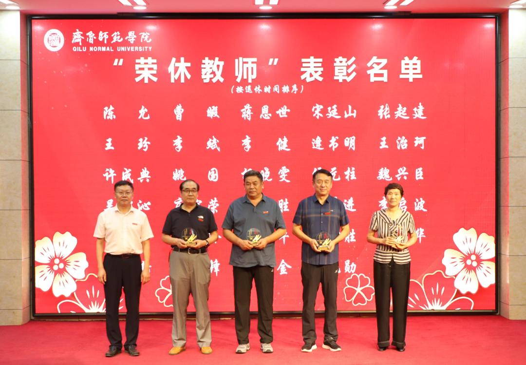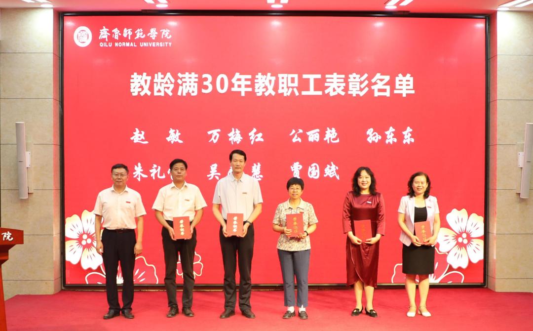 颁奖典礼上,以视频形式展示了2023年度“齐鲁师范学院教书育人楷模”“齐鲁师范学院最美教师”荣誉称号获得者的优秀典型事迹。赵敏为2023年度“齐鲁师范学院教书育人楷模”获奖代表颁奖;郑秀文为2023年度“齐鲁师范学院最美教师”颁奖;林松柏为2023年度“教龄满30年教职工”代表,2022-2023学年荣休教师代表颁发荣誉证书和奖牌。新入职教师代表为教龄满30年教职工及荣休教师代表献花致敬,表达了对老教师们最诚挚的敬意和最美好的祝愿,以及立足使命、赓续始终的坚定信念。