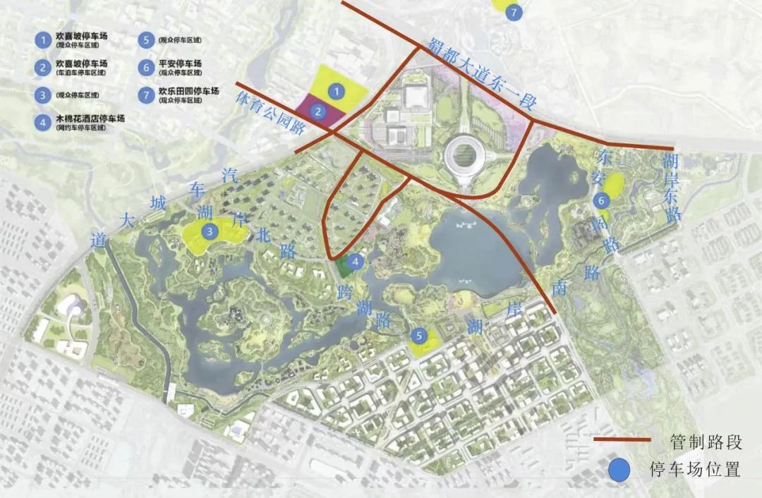 2、场馆周边其它停车场:欢乐田园停车场、湖岸北路临时停车场、东安湖公园地面停车场、木棉花酒店停车场、平安临时停车场、主媒体中心停车场、东安湖南广场停车场等。