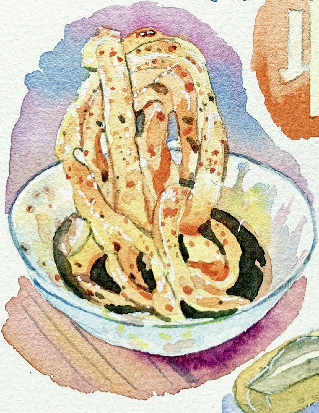 插画_ 曹语庭如果在家吃饭,巴金就以简单的素面或泡饭打发。说到面,成都甜中有辣、麻辣甜香的甜水面始终为巴金所喜爱,吃的是乡情,“先生喜欢吃北门上的甜水面和素面,是挑着担担卖的,做面就在担前两尺不到的木板上揉合面团,分张,做成工艺程度很细致的甜水面,调和用成都北门政府街一家酱园铺特作的红酱油、熟油辣子、麻酱、花椒油、蒜泥”。