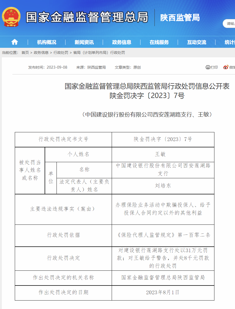 一份“陕金罚决字〔2023〕7号”的行政处罚信息公开表显示,中国建设银行股份有限公司西安莲湖路支行存在“办理保险业务活动中欺骗投保人、给予投保人合同约定以外的其他利益”的违法违规行为,根据《保险代理人监管规定》第一百零二条规定,国家金融监督管理总局陕西监管局对中国建设银行莲湖路支行处以31万元罚款;对相关当事人王敏给予警告,并处8千元罚款的行政处罚。