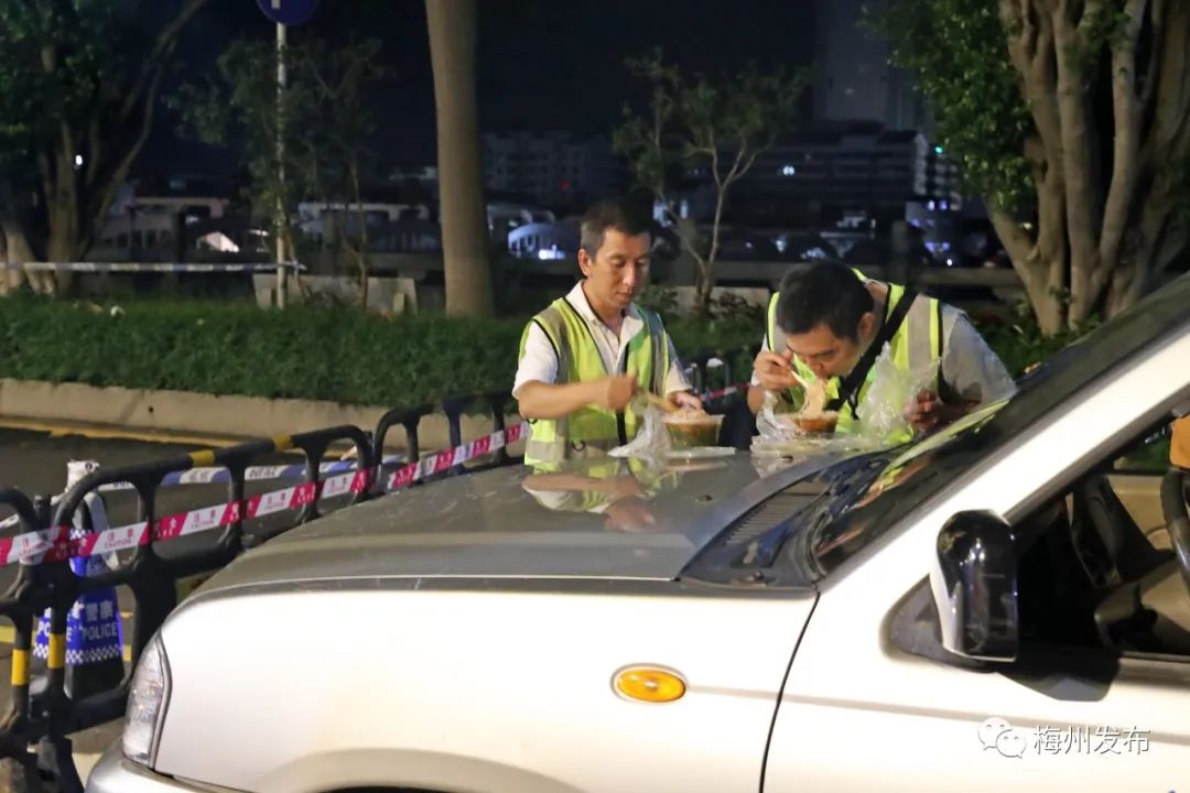 8日0时50分,在沿江东路值守的工作人员抽空就地吃点东西准备连夜值守。此时梅城天气晴,街道路面干净无恙。梅州市应急管理局的工作人员还在紧盯着洪峰压境的风险监测电脑大屏幕不敢有丝毫松懈,随时准备着做出应对方案;城区的任何一个低洼危险地带都已经拉起了警戒线;沿江堤岸上,公安、消防、应急等人员来回巡逻,路上的警车喇叭播报着劝导群众注意安全早点回家的提醒。