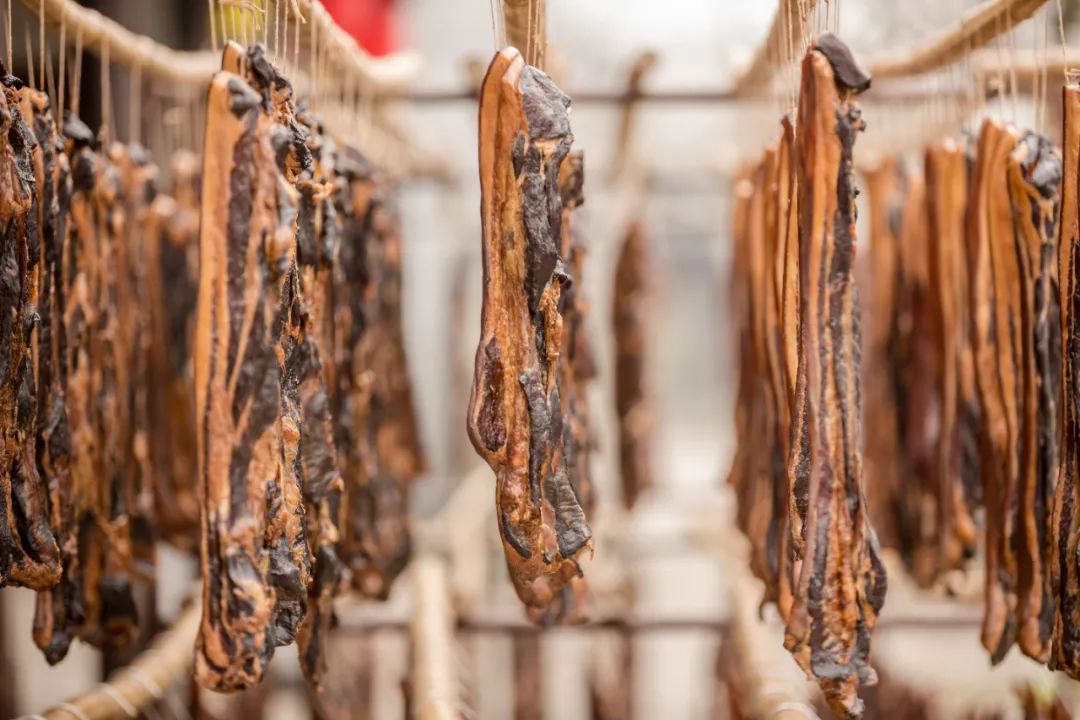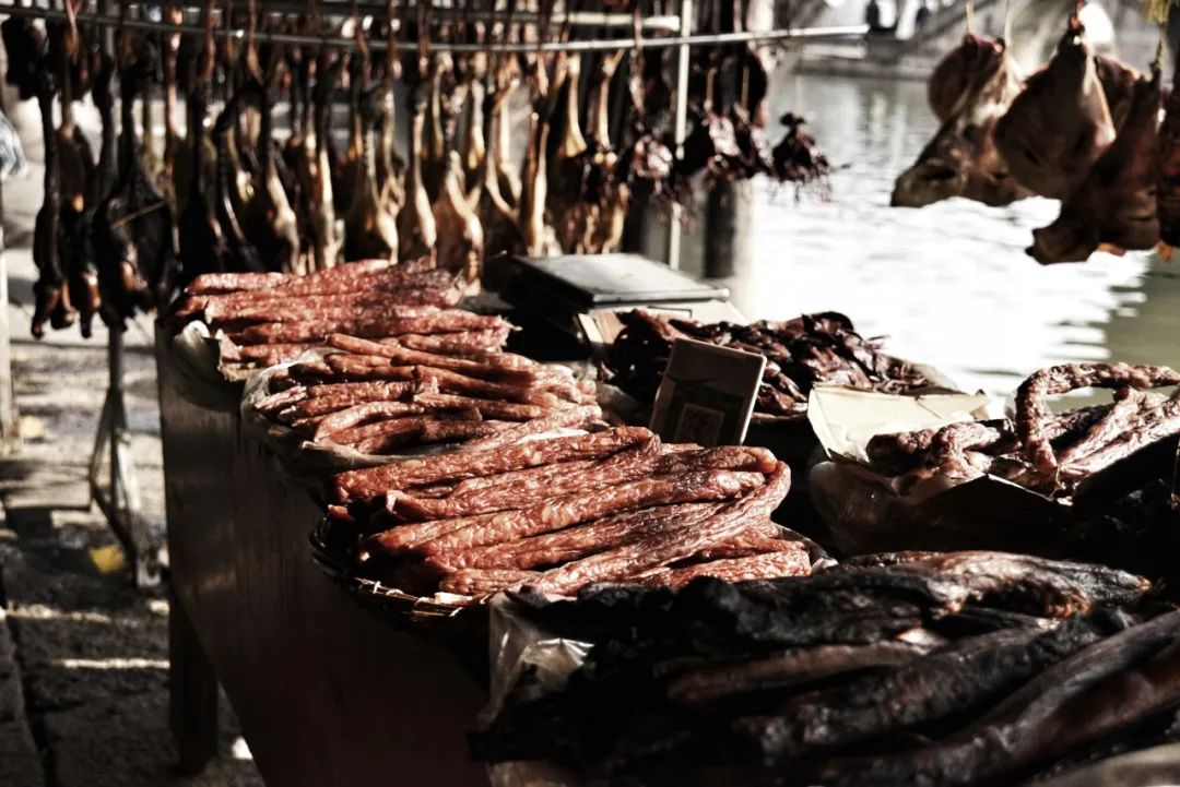 那些腊肠都是由当地居民纯手工制作,原汁原味,外表看起来有点黑乎乎的,可吃起却肉香四溢。