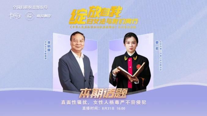 8月31日,由人民法院新闻传媒总社和中国妇女杂志社联合推出的新妇女权益保障法系列普法直播第三场《直面“性骚扰”,女性人格尊严不容侵犯》在人民法院报视频号、微博,中国妇女杂志全媒体“帼姐”快手、微博、视频号,天平阳光APP等平台同步播出。中华女子学院教授李明舜、北京市第三中级人民法院法官姜君做客直播间,与广大网友共同探讨如何更好地维护女性的人格与尊严。