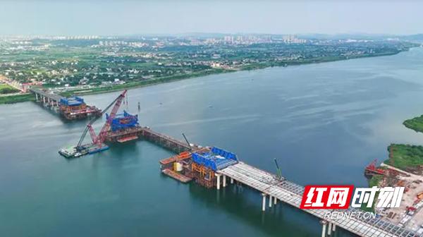 视线来到暮坪湘江特大桥建设现场,一座形似飞燕的大型蓝色钢梁空间立体结构稳稳屹立在碧波广阔的江上,百余名建设工人有序分布在从水面上崛起的大型钢梁丛林中,抢抓施工。该桥是长沙市南横线的过江通道,连接天心区南部片区与湖南湘江新区大王山片区,目前项目已进入主体冲刺施工阶段,预计年底完成主拱合龙,2024年底建成通车,这将是融城发展又一活力“动脉”。