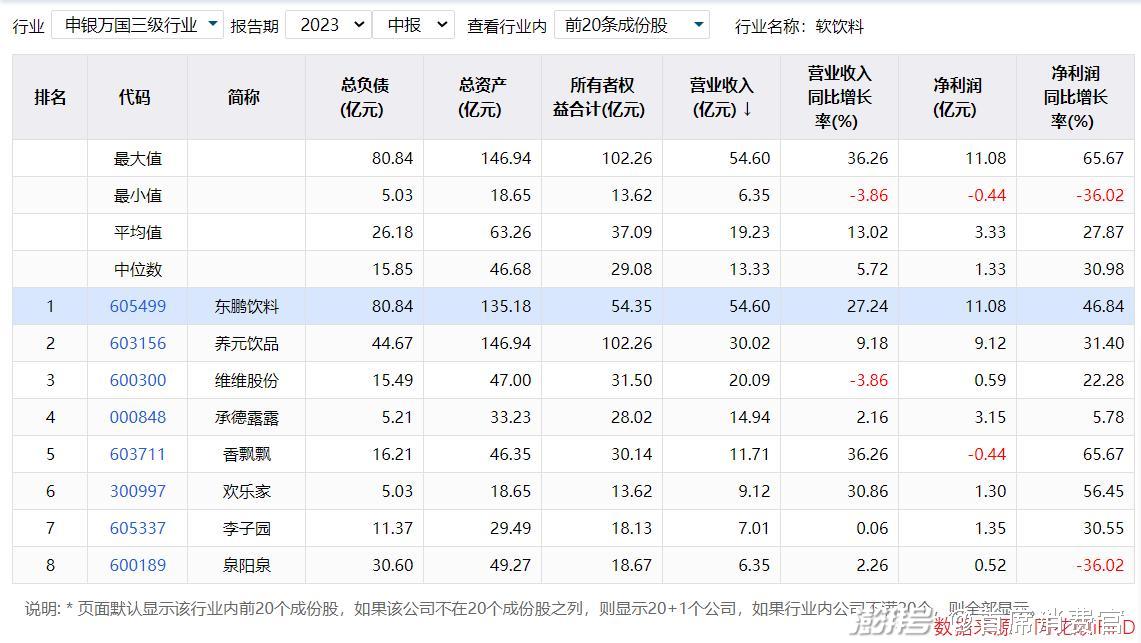 在软饮料行业中,A股的东鹏饮料以54.60亿元的营业总收入排在首位,养元饮品以30.02亿元的营业总收入排在第二位,维维股份以20.09亿元的营收排在第三位。