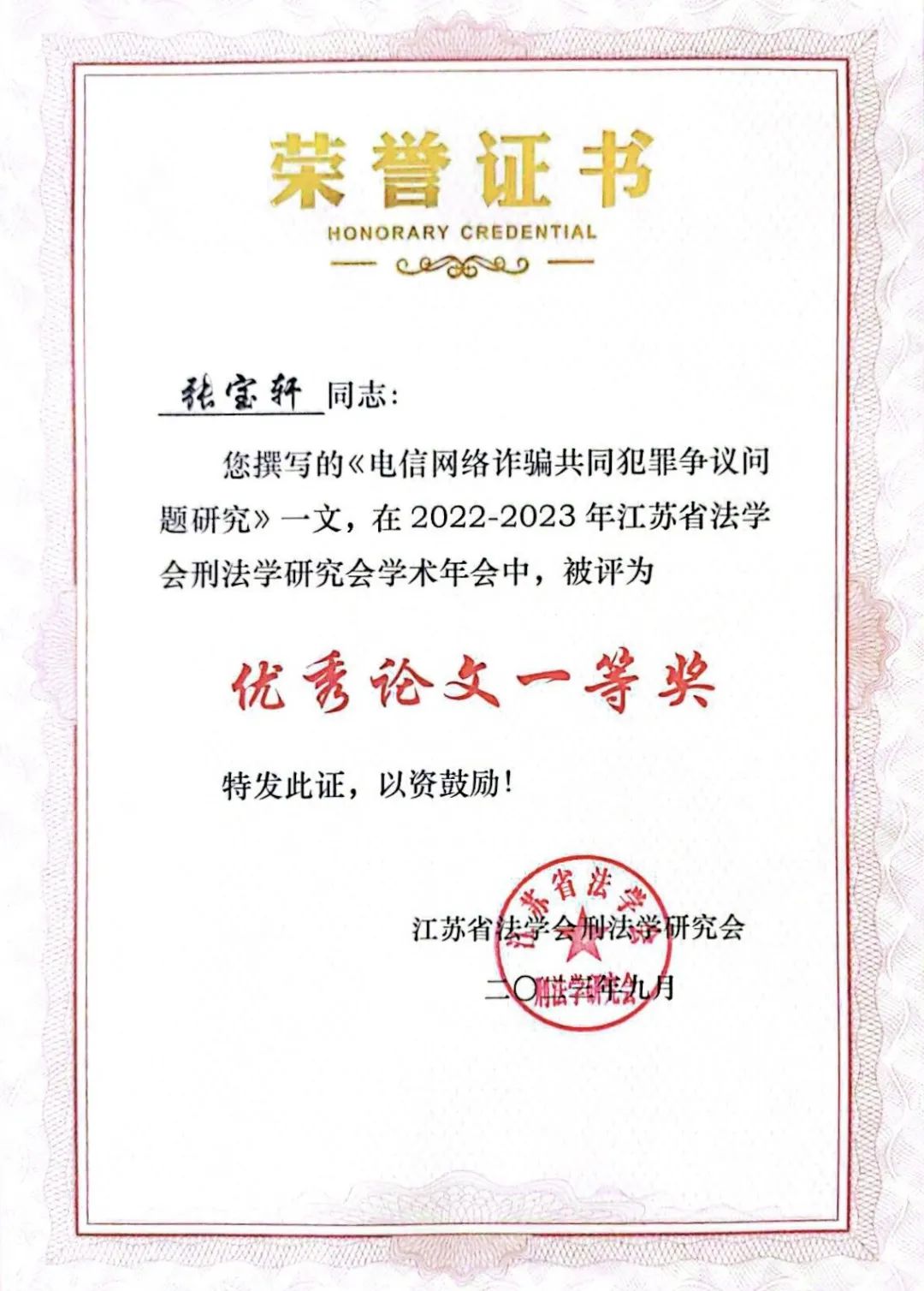 苏州市吴中区人民法院刑庭员额法官张宝轩撰写的论文《电信网络诈骗共同犯罪争议问题研究》在江苏省法学会刑法学研究会2022-2023年年会中获评一等奖。