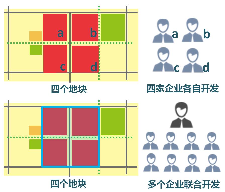 二是允许若干企业联合竞得一块创新型产业用地,采取“统一代建”、“企业联盟”等方式进行开发,建成后按照各企业使用需求,通过物业分割获得相应面积的产权(图4)。