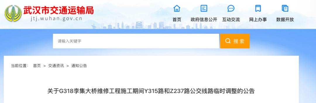 G318李集大桥维修工程将于2023年9月16日至2024年3月16日进行封闭施工,施工期间,Z237路和Y315路公交线路进行临时调整,具体如下:◆Z237路(邾城客运站—仓埠街道办事处)调整为邾城客运站—李集街(与Z211邾城客运站—李集街共用公交末站)、G318彭泗村—仓埠街道办事处两个区间运营;Z237路区间票价均调整为2元。