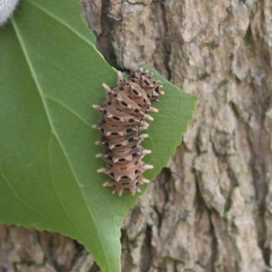 重阳木锦斑蛾重阳木锦斑蛾是本市重阳木的常见食叶性害虫,单食性,只取食重阳木叶片,因此无扩散危害周边其他植物之虞;重阳木锦斑蛾的老熟幼虫体长2厘米左右,褐色,每个体节长有黑斑与突起的肉刺,状似“小海参”,这些黑斑与肉刺对人体无害,胆子大一点的甚至可以放手摸一摸,体会一下“小海参”绵软的手感。
