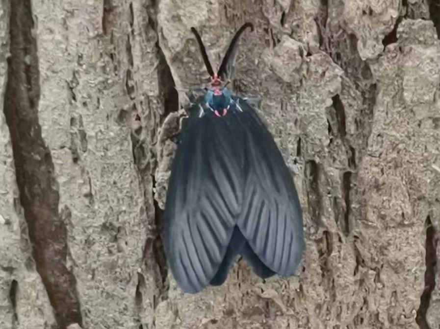 重阳木锦斑蛾的成虫体长2.5厘米左右,有两根黑色的触角,身体为红色,翅膀也是黑色的,神秘中带一点点邪魅,在发生量较大的时候,它们会在周边区域飞舞、停留。如果留意观察,大家可以发现重阳木锦斑蛾的幼虫和成虫都是鸟儿们的美味佳肴。