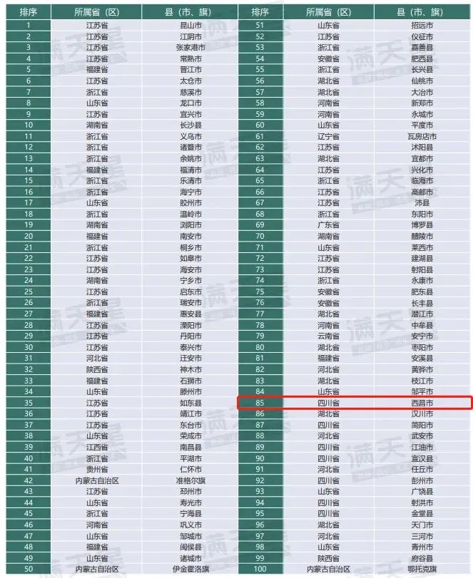 日前,赛迪顾问“2023赛迪百强县”榜单发布。根据榜单,四川共7个县(市)上榜百强,分别为西昌市、简阳市、江油市、宣汉县、彭州市、射洪市和金堂县。其中,西昌市位列第85位,四川县域第一。