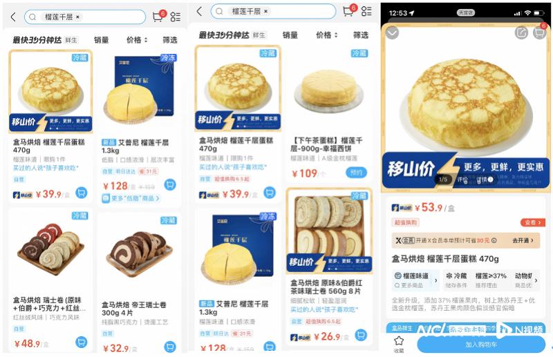 盒马APP在北京、上海、广州三地的榴莲千层蛋糕的“移山价”对比“移山价”拓至15城