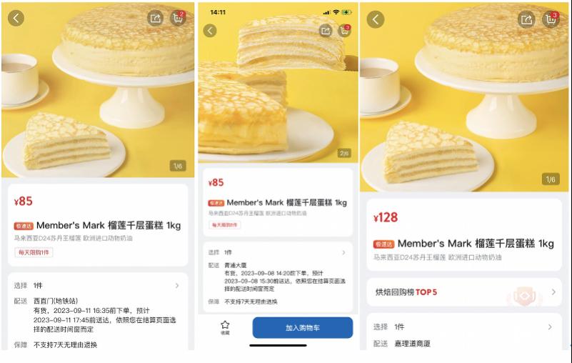 不过,经过调查发现,山姆的应对规模有限,调价商品主要是旗下自有品牌的部分烘焙爆款。登录山姆APP可以看到,截至9月11日,北京、上海两地的榴莲千层蛋糕价格依然维持在85元/1kg,没有新变动。其他区域的榴莲千层则一直没有降价,广州、深圳仍是128元/1kg。