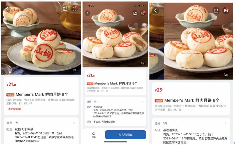 中秋临近,“价格战”中自然少不了早已是山姆爆款的鲜肉月饼。山姆APP上,仅北京、上海的鲜肉月饼21.9元/9个,广州、深圳等地为29元/9个。