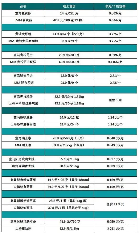 山姆APP在北京、上海、广州三地的鲜肉月饼价格盒马“移山价”则持续上新,主打商品包括麒麟西瓜、麻薯、鸡蛋、秋月梨、奇异果、猪肋排、青提等,价格均对标山姆。