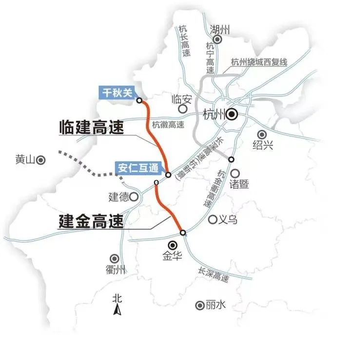 临建高速示意图据了解,临建高速临安至建德段起点位于浙江与安徽交界的千秋关,是联通浙皖的省际通道,途经临安、桐庐、建德,终止于杭新景高速建德境内的安仁枢纽,全长85.5公里,其中建德境内长度为4.2公里,设计时速100公里,新建了7座大桥以及3座隧道,并在安仁枢纽扩建9条通道。