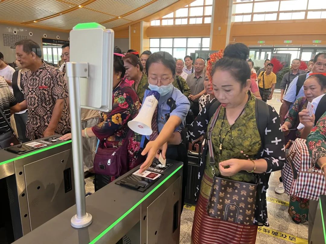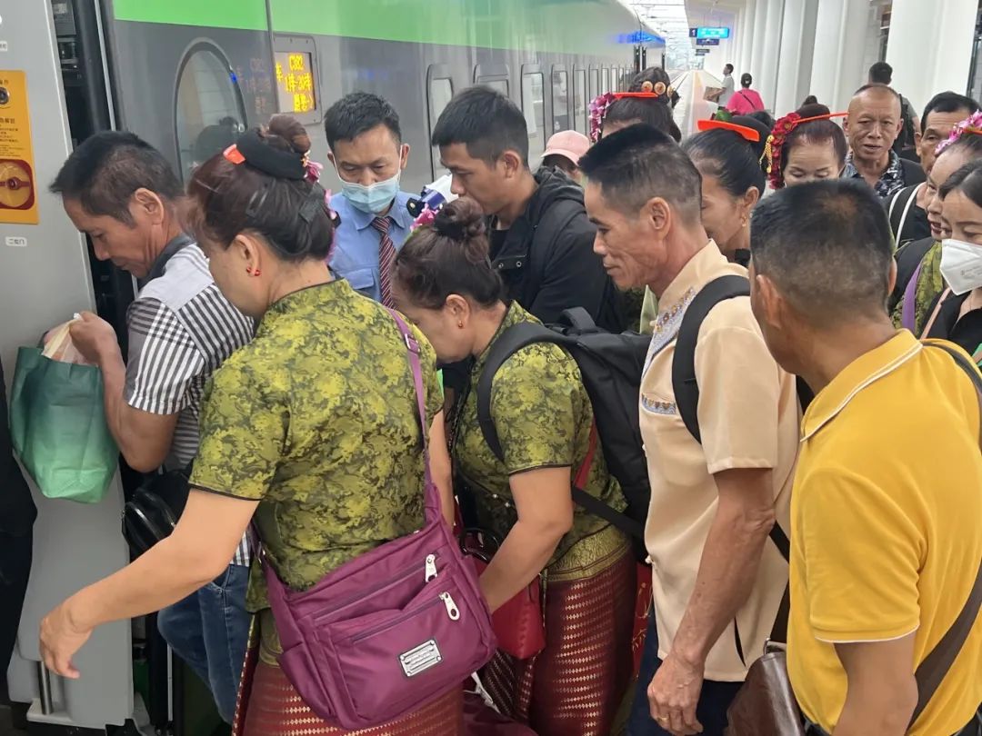 “请大家排好队,不要着急。列车抵达磨憨站后,请听从工作人员引导进行换乘。”9月12日7时49分,中国铁路昆明局集团有限公司橄榄坝站进站口处,客运员李保山正耐心地组织一批傣族旅客排队乘车。
