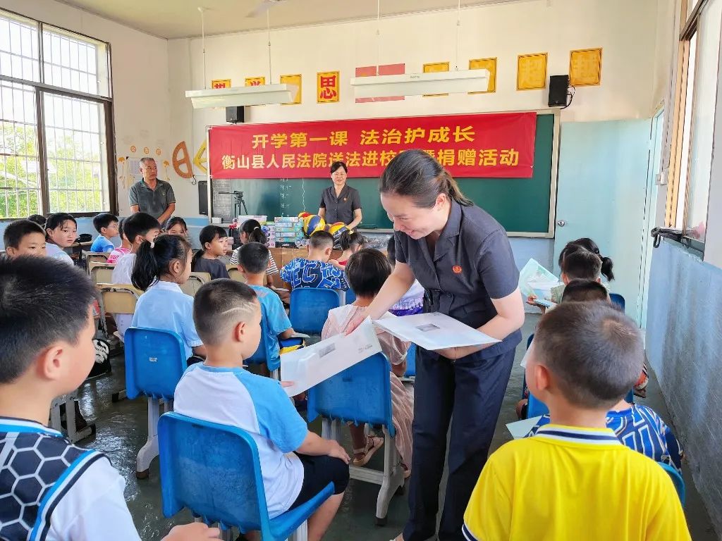 在活动仪式上,衡山法院党组成员、政治部主任高亚香代表法院向在校学生赠送积木、篮球、毛笔、字帖、文具、书籍等文体用品若干,并贴心地为全校37名学生都准备了一个开学大礼包。