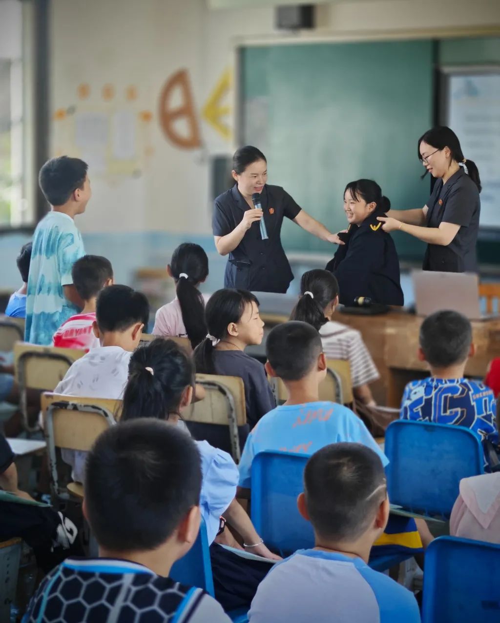 普法课堂上,旷雯文结合自身办案经历,将一个个真实的案例通过情景解说的形式予以场景再现,围绕“防校园欺凌”“防性侵”“防诈骗”三个方面的法律内容,让学生及家长在一片轻松愉快的氛围中解锁了更多的风险防护技能,受到了全校师生和家长的一致好评。