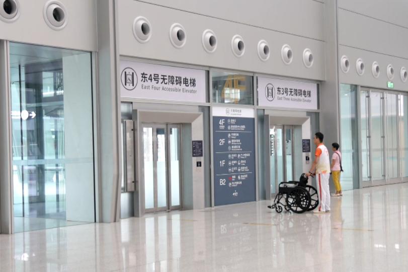 在地铁站厅层、地下停车夹层、广场层等处均设置了无障碍垂梯,距离各落客区的直线距离均在50米内,无论是自驾、打车还是乘地铁公交的特殊旅客,都可享受更便捷顺畅的换乘体验。