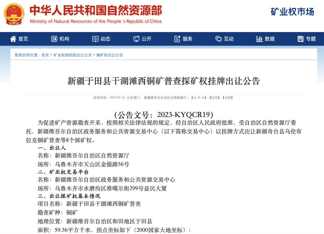 新疆于田县干湖滩西铜矿普查探矿权挂牌出让公告