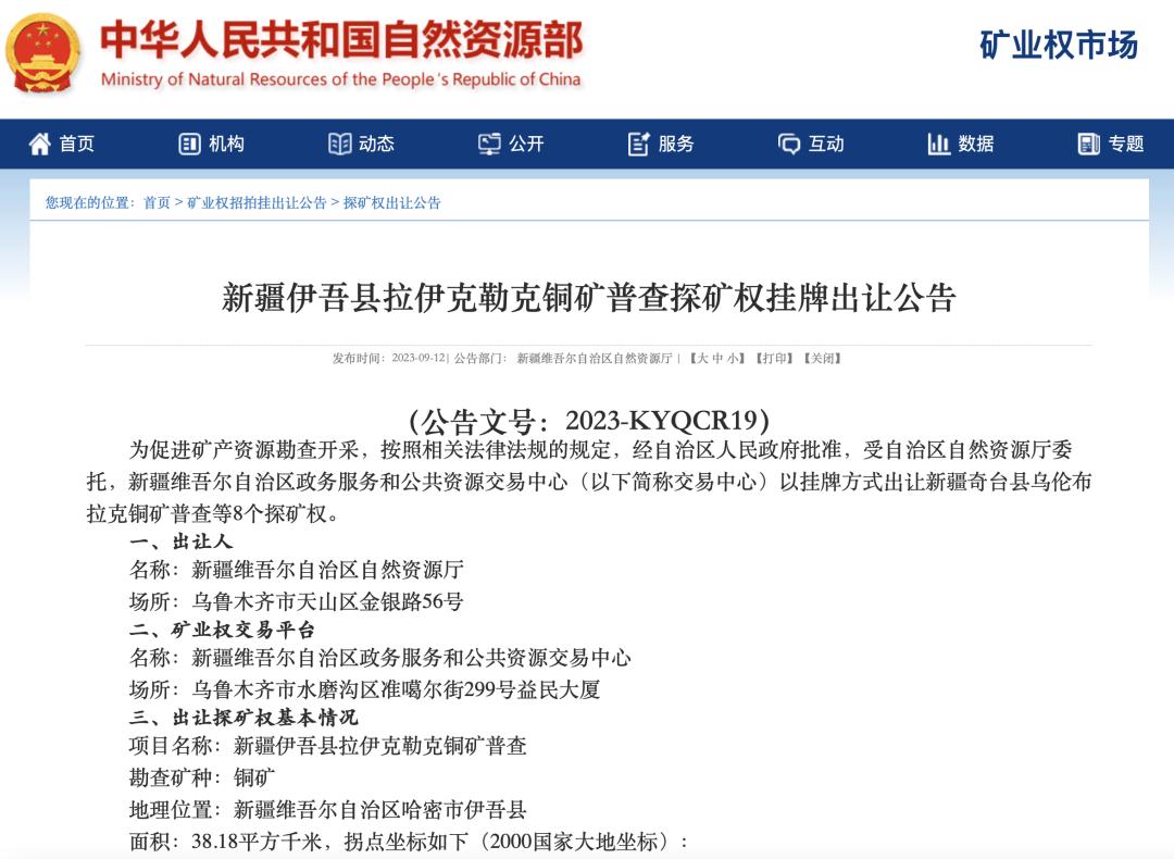 新疆伊吾县拉伊克勒克铜矿普查探矿权挂牌出让公告