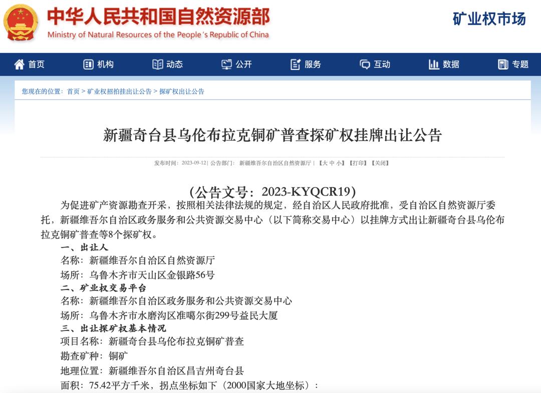新疆奇台县乌伦布拉克铜矿普查探矿权挂牌出让公告