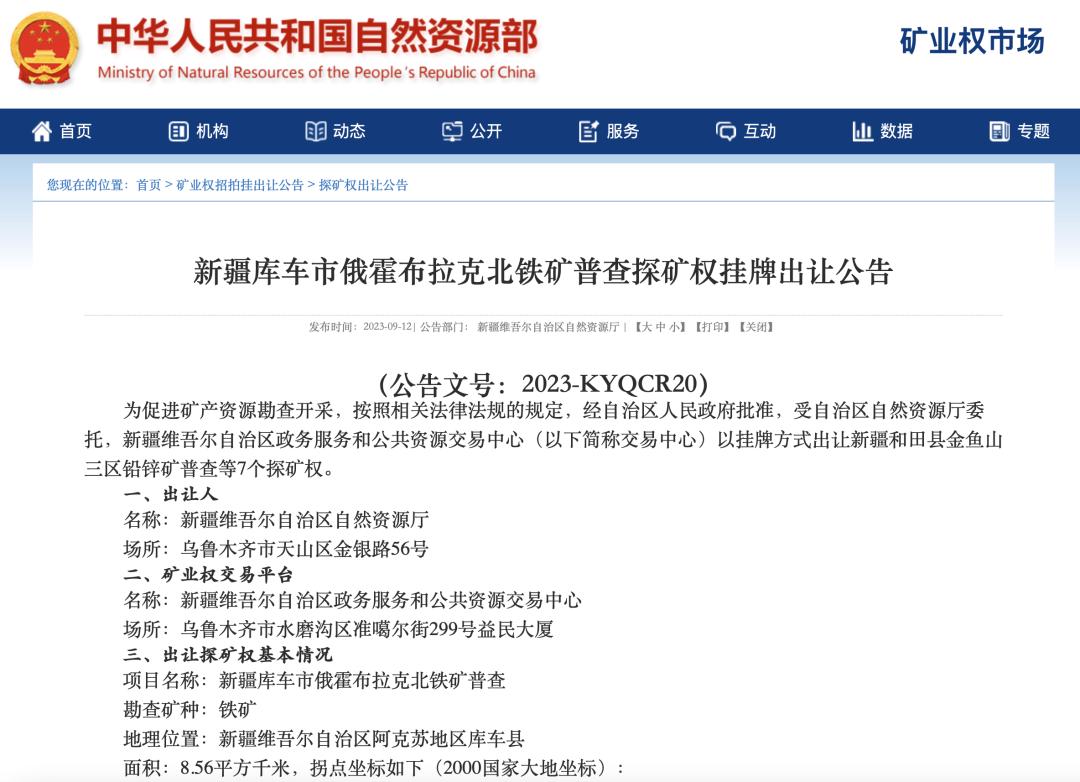 新疆库车市俄霍布拉克北铁矿普查探矿权挂牌出让公告