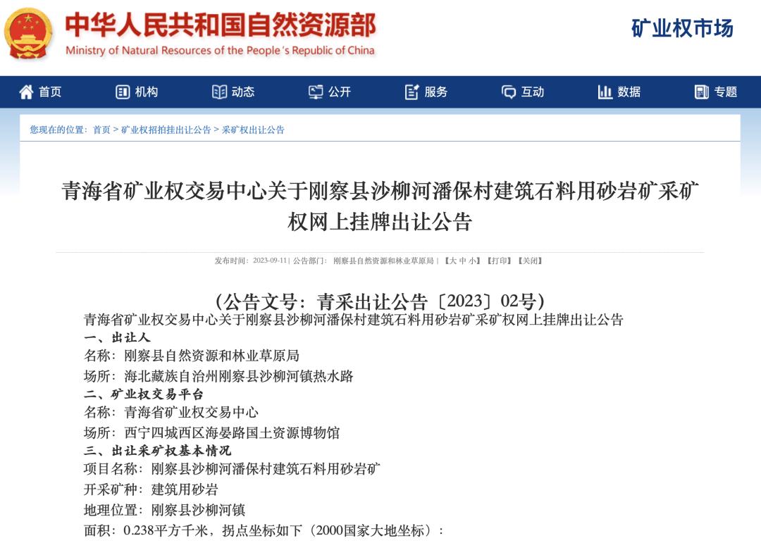 青海省矿业权交易中心关于刚察县沙柳河潘保村建筑石料用砂岩矿采矿权网上挂牌出让公告