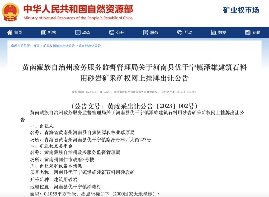 黄南藏族自治州政务服务监督管理局关于河南县优干宁镇泽雄建筑石料用砂岩矿采矿权网上挂牌出让公告