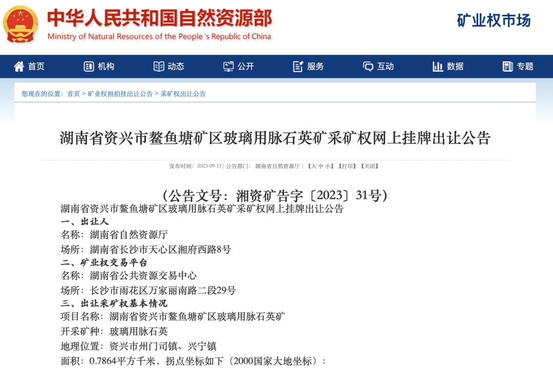湖南省资兴市鳌鱼塘矿区玻璃用脉石英矿采矿权网上挂牌出让公告