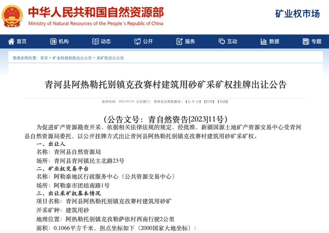 青河县阿热勒托别镇克孜赛村建筑用砂矿采矿权挂牌出让公告