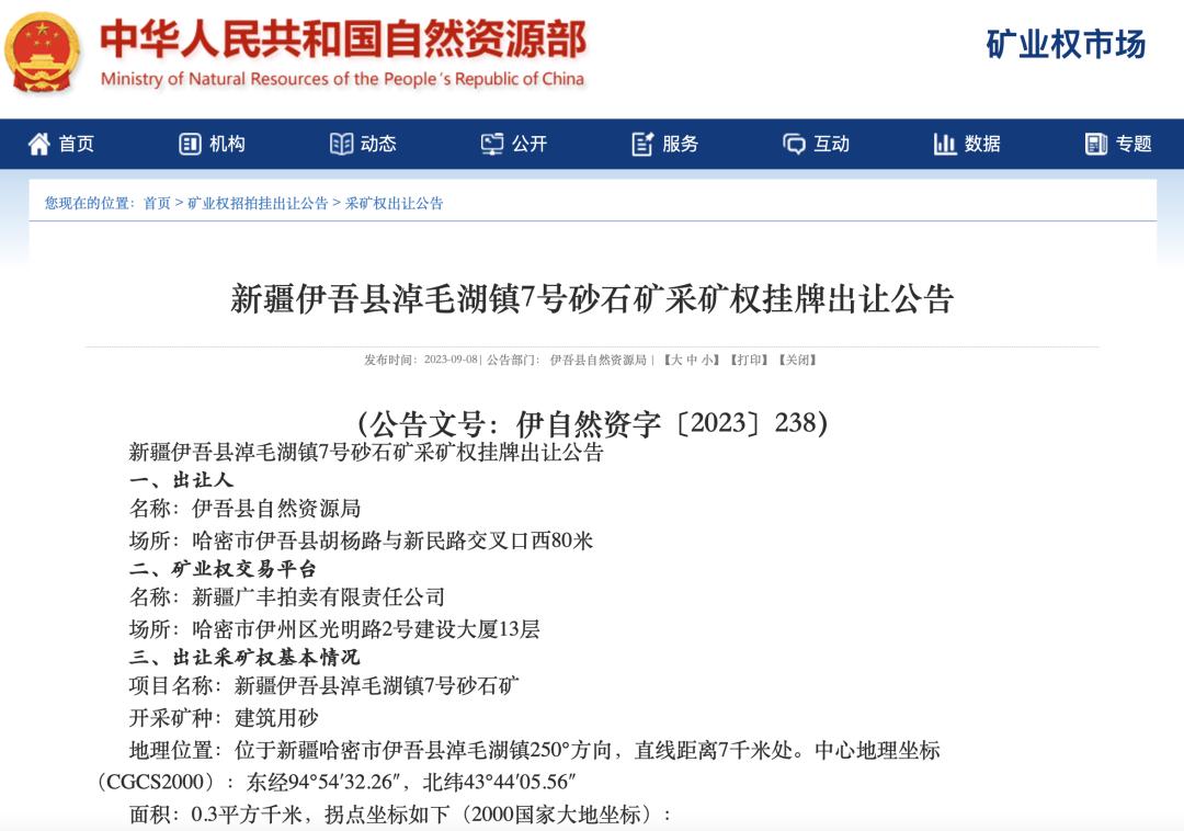 新疆伊吾县淖毛湖镇7号砂石矿采矿权挂牌出让公告