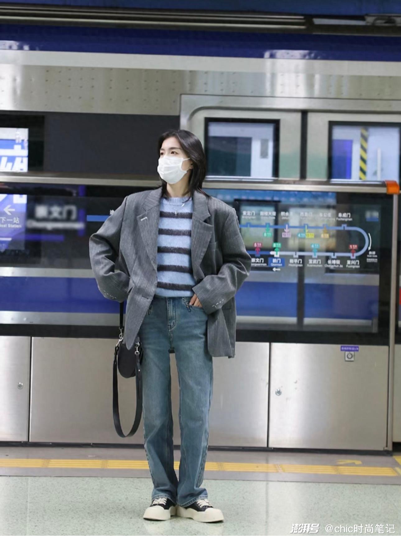 男友风宽松灰色西装外套内搭条纹蓝色毛衣,休闲而松弛,下身搭配一条直筒牛仔裤,整个造型帅气又简单。