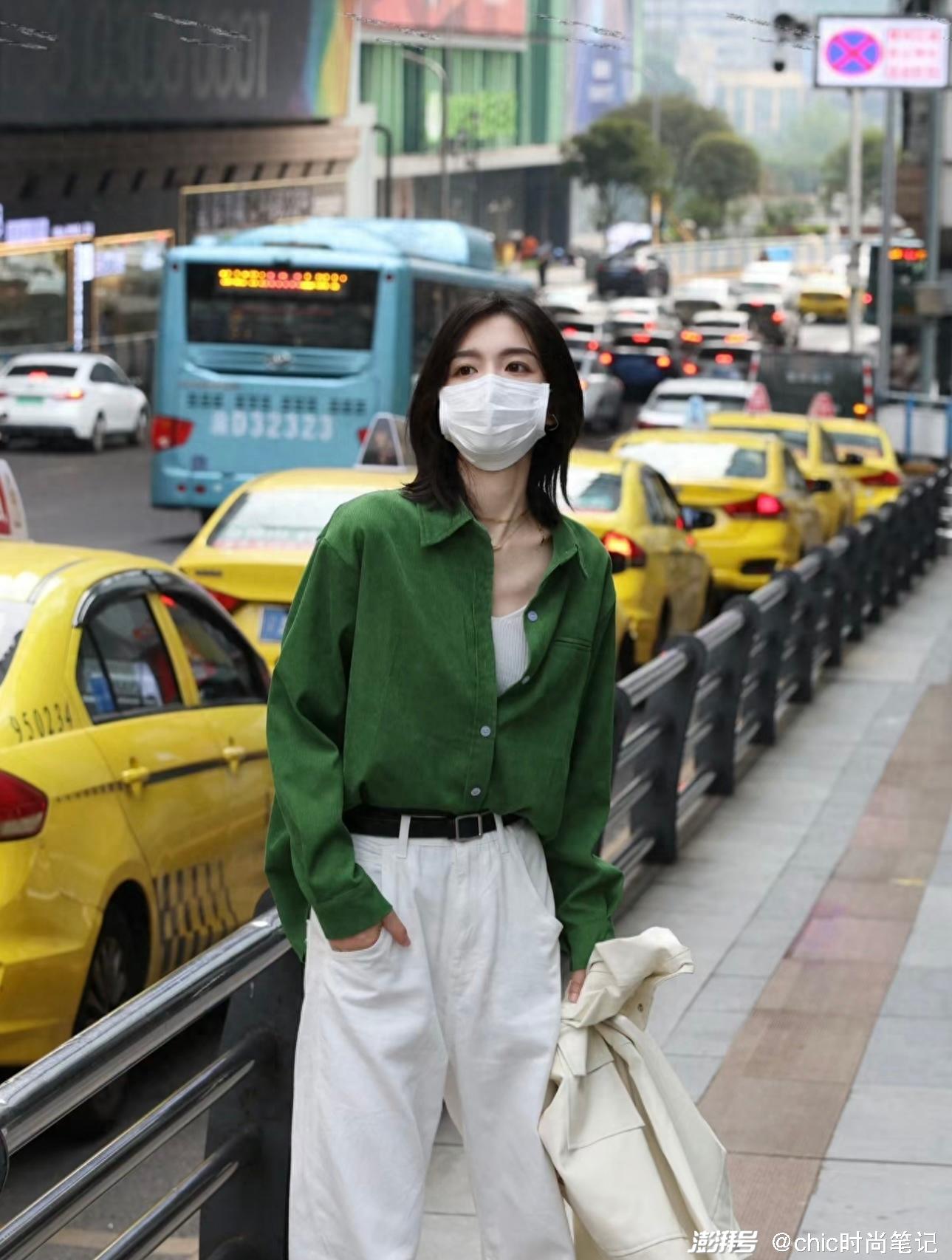 入秋后在选择颜色上不要太过跳跃,选择深色系的颜色会更搭。深绿色质感衬衫内搭白色T恤和白色休闲裤,清新又自然。